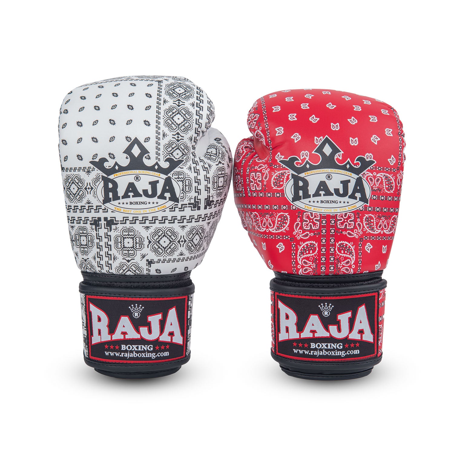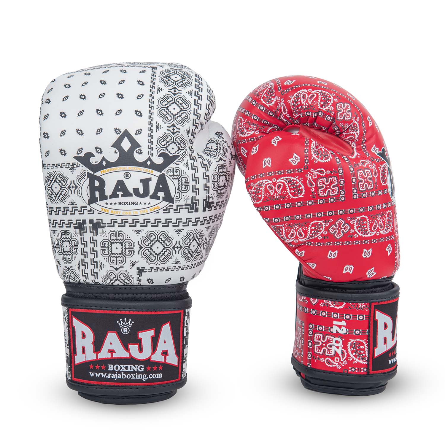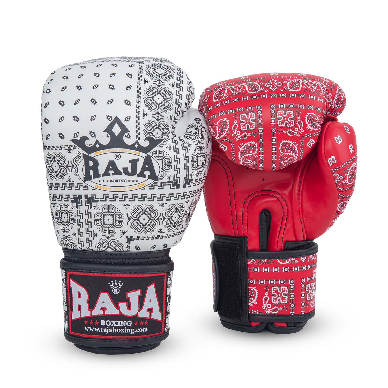 בלטו בזירה או באימון עם כפפות האיגרוף המקצועיות Raja Bandana Series בעיצוב אדום ולבן.